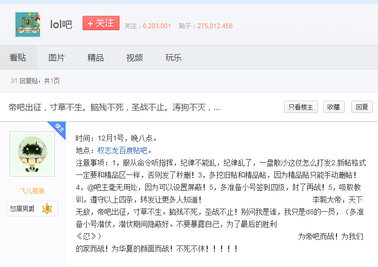 這是來自LOL貼吧出征前的號令,多么有水軍氣勢!!!