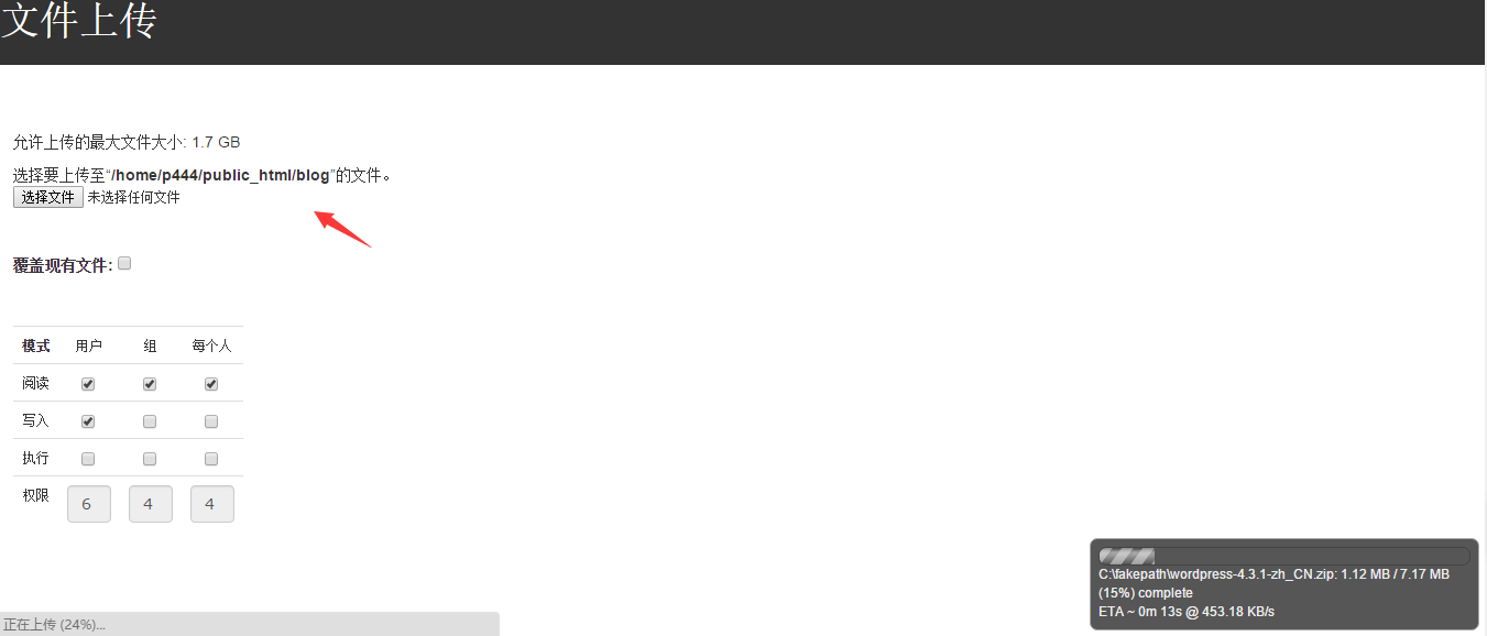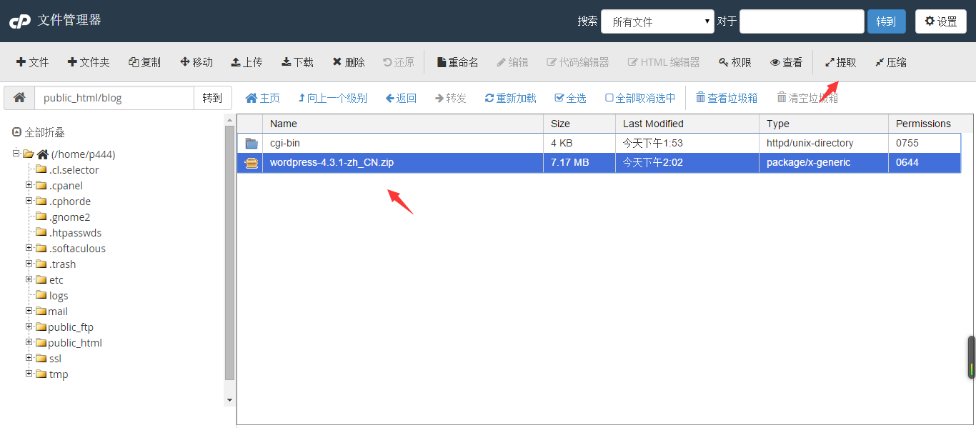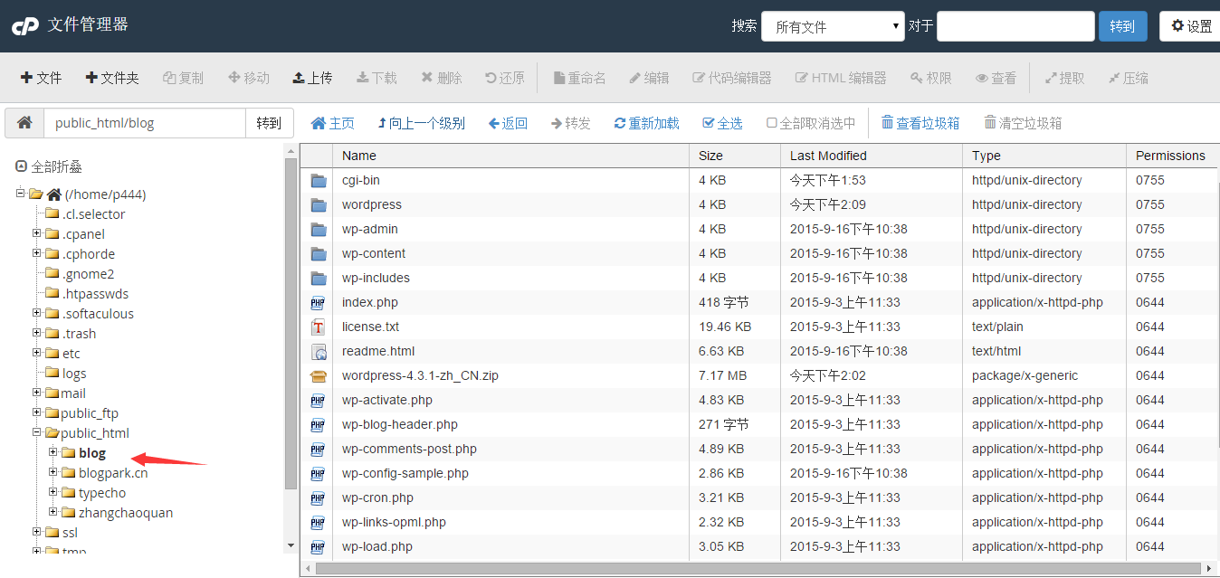 上傳完成我們返回blog目錄,把上傳的wordpress程序解壓