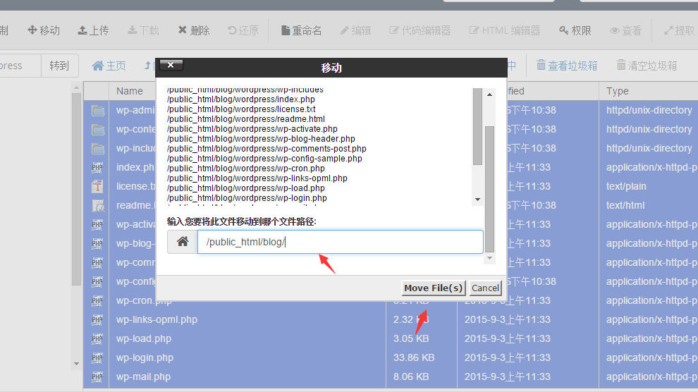 然后把解壓之后的wordpress目錄里的所有文件移動到blog目錄下