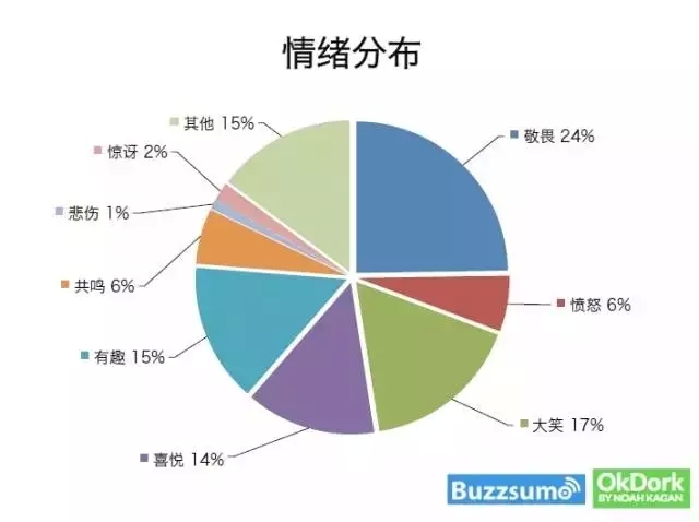社交媒體追蹤服務分析工具BuzzSumo,前后對社交媒體上超過1億篇文章進行了分析,發(fā)現(xiàn)那些獲得最多分享轉發(fā)的內容能引起用戶的情緒變化依次是:敬畏(25%)、大笑(17%)、娛樂消遣(15%)、高興(14%)、共鳴(6%)、憤怒(6%)、驚奇(2%)、悲傷(1%),其他情緒類型占15%。內容激起用戶情緒,情緒帶動轉發(fā)行為。