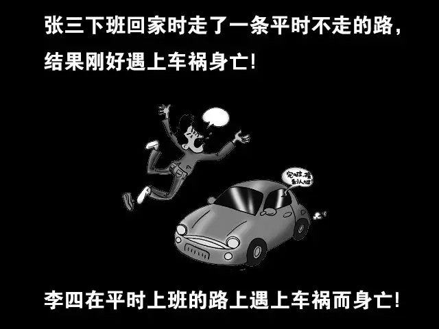 如:張三下班回家時走了一條平時不走的路,結構剛好遇上車禍身亡;李四在平時上班的路上遇上車禍而身亡。哪種情況下事故死亡者家屬更可能感到悲傷?