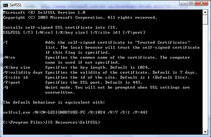 安裝好之后,點擊“開始”-“所有程序”-“IIS Resources”-“SelfSSL”,打開SelfSSL,界面如下: