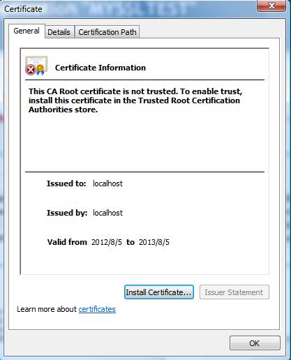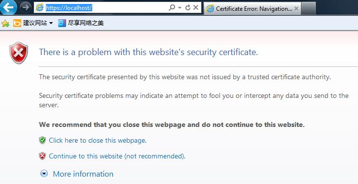 我們創建的證書,Issued To,Issued By都是同一個,這種叫做根證書,該證書需要存放在Trusted Root Certification Authorities目錄下,網站才會被信任,這可以通過certmgr.msc查看。那么如何讓SSL驗證通過呢,即如何讓鎖形安全標志出來呢,有兩種方法: