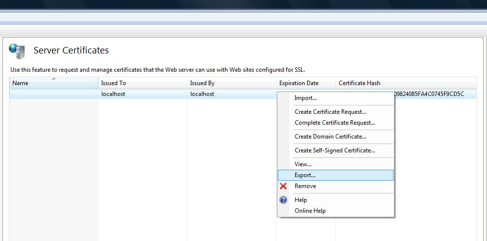 2.回到IIS,打開Server Certificates,選中我們創建的證書,右鍵,導出證書,見圖: