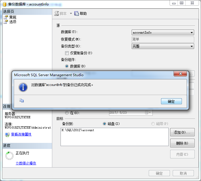 4、之后在備份數(shù)據(jù)庫窗口點擊確定,等待備份成功