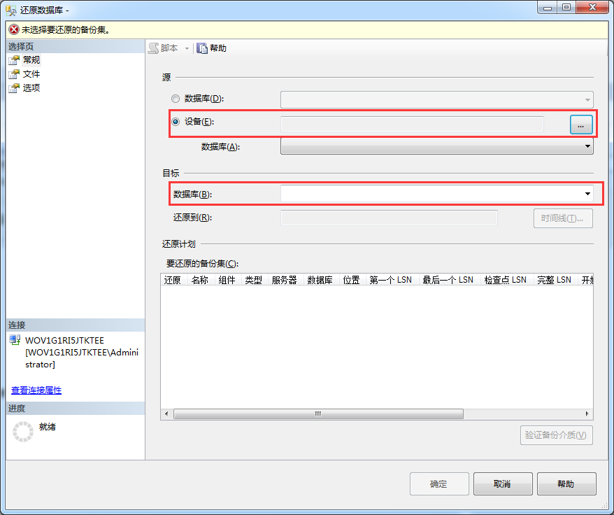 2、在彈出的【還原數(shù)據(jù)庫】窗口,選擇【設備】,并點擊右側的【...】;在彈出的【選擇備份設備】窗口,點擊【添加】,找到備份的文件;在【還原數(shù)據(jù)庫】窗口中【目標-數(shù)據(jù)庫】處輸入數(shù)據(jù)庫名稱,并單擊【確定】。