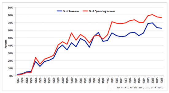 iPhone 很顯然是目前蘋(píng)果公司的領(lǐng)軍產(chǎn)品,蘋(píng)果 65% 以上的營(yíng)收都是由 iPhone 貢獻(xiàn)的,盡管蘋(píng)果繼續(xù)壟斷著智能手機(jī)行業(yè)的利潤(rùn),而蘋(píng)果也擁有一個(gè)前所未有的盈利業(yè)務(wù),但是 iPhone 需求量在經(jīng)歷了巔峰后早晚都會(huì)滑落,這肯定會(huì)對(duì)蘋(píng)果帶來(lái)非常重大的影響。