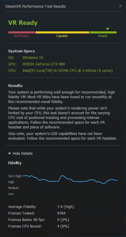 該圖說明這臺電腦適合運行HTC Vive的內(nèi)容,其系統(tǒng)為Windows 10,顯卡是GTX980,處理器是i5-3570k。當(dāng)然,如果能獲得這款測試工具的好評,再檢查一下內(nèi)存是否達(dá)到8GB以及視頻輸出端口是否能兼容HDMI1.3,就能確認(rèn)這臺電腦是否同樣能夠運行Oculus Rift了。
