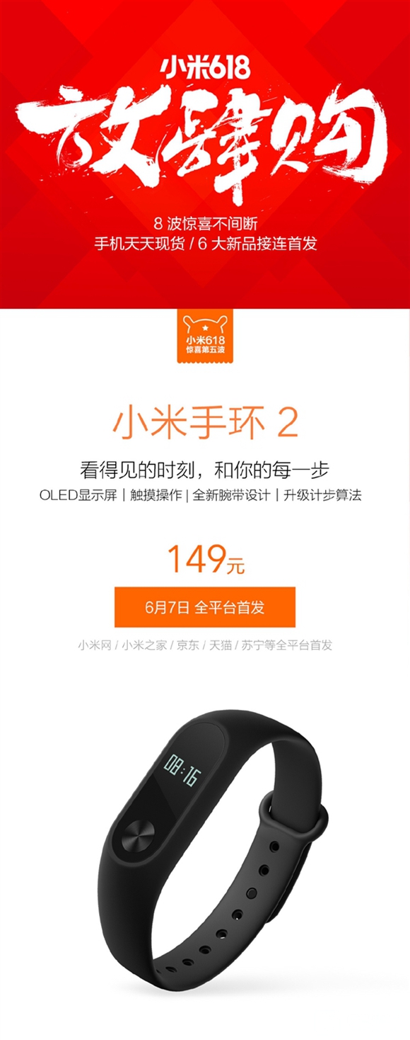 小米手環(huán)2將于6月7日10:00全網(wǎng)首發(fā),小米網(wǎng)、小米之家、京東、天貓、蘇寧多平臺同步現(xiàn)貨銷售,可享受149元包郵。