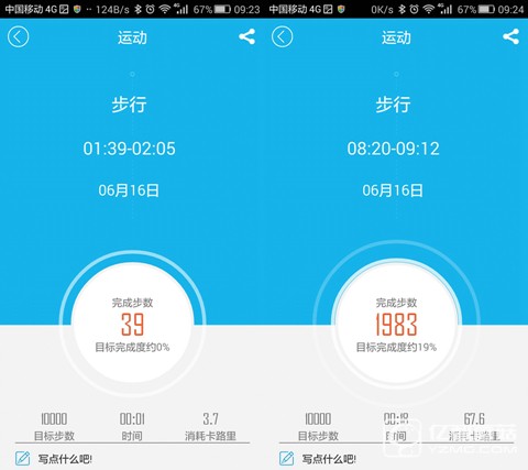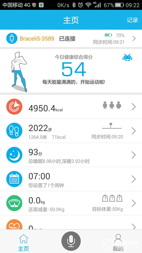 點擊運動,能看到每天的步數及消耗的卡路里,還有距離、時長、速度等,并可生成柱狀圖,以及減肥的目標度。這里說一下記步功能,佩戴了幾天,自動監測記步的功能很強大,就算是運動時與手機連接斷開也沒事,下一次連接時會自動同步數據。