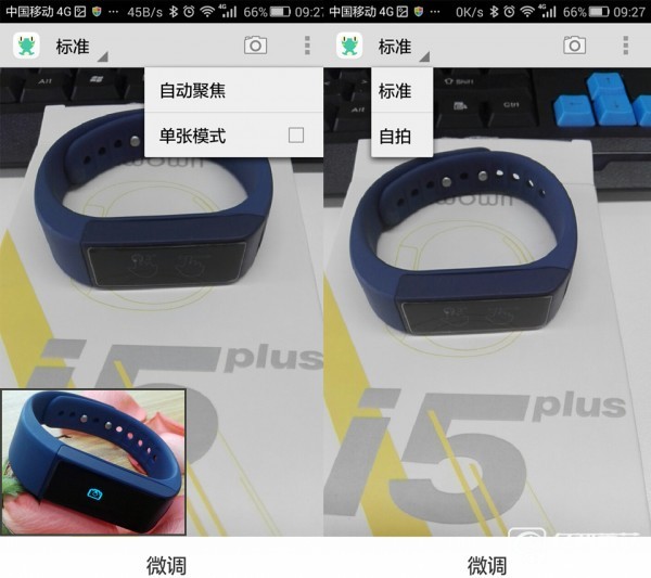 記錄里還有一個智拍功能,相比I5,功能更加強大了,當點擊此按鈕時,手環會進入拍照模式,并支持自動對焦和微調,點擊手環上面的圖標,手機就可以自動拍照,自拍控必備。