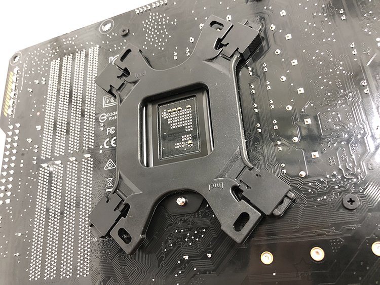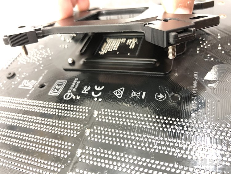 2、我們先將主板反過來,需要從主板的背部進行安裝,將CPU散熱器的背板扣具四顆螺絲對應主板的四個孔位穿過去。如果CPU散熱器的背板扣具四顆螺絲無法對齊主板上的4個孔位,可以向外或者向內自由調節背板扣具,如下圖所示。