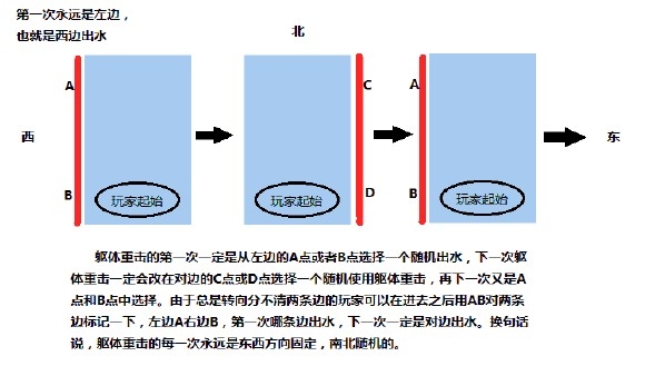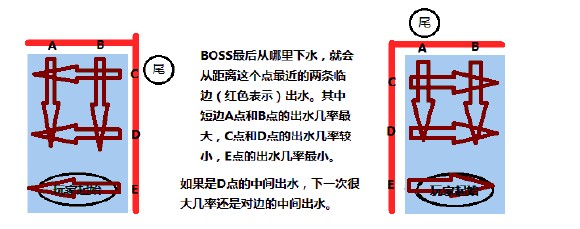 再說一下軀體沖擊,也就是龍車的躲法。軀體沖擊也不是任何地方都會(huì)出來的,每次BOSS下水之后如果下一次是軀體沖擊,那么一定會(huì)從離尾巴下水的地方最近的兩條臨邊出水,換句話說BOSS最后從哪個(gè)點(diǎn)下水,就從離那個(gè)點(diǎn)最近的兩條臨邊出水。而且短邊的出水幾率大于長邊的,如果是中間出水,那么下一次很大幾率也是對(duì)邊的中間出水。