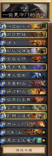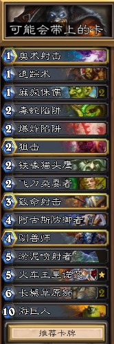 奧術射擊:低費解,在獵人內戰或者打動物園的時候效果會比較不錯,部分獵人會帶上一張,但不建議帶兩張。