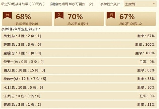 每個賽季開始的第一天,尤其是0點剛開始,基本天梯都是獵人和動物園,這個時候用獵人以暴制暴比較不錯。不過我都是第二天早上開始打,快攻會相對少一些,所以我一開始用的是牧師,10-20分鐘一局的對局,雖然讓人很累,不過偶爾玩玩牧師也是個鍛煉口算能力的時候。到了7級,發現遇到了坎,所以改用獵人,一路連勝到了5級,但是不知道大家怎么認為,我是覺得玩獵人的時候心里總是很虛,總覺得沒有續航能力,所以我本人并不是很喜歡用獵人。因此,我5級之后,就開始用土豪戰,做一個安靜的有安全感的美男子。廢話不說,卡組也不是很新,我就介紹介紹我的一點心得,怎么說呢,還是靠吃獵人上分的。