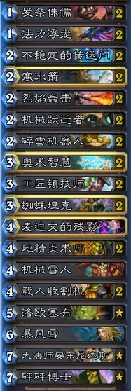 為了應(yīng)對動物園、薩滿和圣騎的強力鋪場,加入了一張暴風(fēng)雪,同時也能對抗小德的塞納留斯。比呼啦低一費就多了一分安全,而且很多時候?qū)γ驿伒墓植⒉粫艽螅╋L(fēng)雪基本夠用了,另外還有10費的暴風(fēng)雪火球(安東尼在場)叫殺combo。