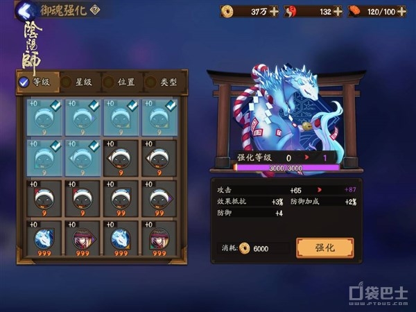 御魂的強化方式同樣是低階御魂“喂養”高階御魂,每次強化都可以提升御魂的特定加成屬性,且這種強化是永久性的。從游戲性上來說,將不同御魂的套裝屬性進行搭配,對不同的式神進行加成,有特定條件下,可以扭轉戰局,甚至達到破解PK對方戰術組合技的目的,因而式神培養中,技能,星級,覺醒,御魂,一個都不能少。