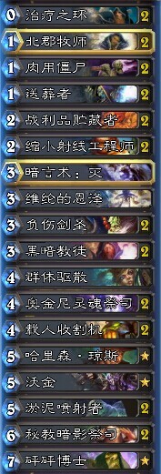 2*治療之環:非常靈活的一張法術,不同于傳統環牧治療之環主要為了配合奧金尼清場和配合劍圣3費47,這套的環更多情況下是配合隨從交換用的,因為牧師的怪通常質量比較高,交換后殘血狀態一個環加滿可以直接勸退對手。如果有北郡的話過牌能力甚至不遜于曾經的禿鷲。當然在面對動物園機械法的時候奧金尼環的combo還是非常關鍵的,但是這套牌里千萬不要吝惜環不舍得用,在隨從交換后使用才是本卡組中環的主要使用方法。