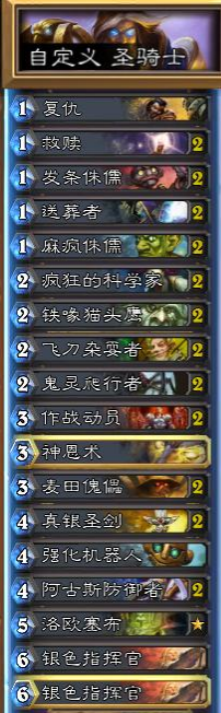 自從GVG時代降臨,圣騎士立馬苦盡甘來,從原本的隱藏職業(yè)轉為一線圣斗士!但是,盡管有那么多的大神卡組保證勝率,但是茫茫多的橙卡,紫卡亮瞎我們的屌絲眼,光軍需新兵配合一波流就得有軍需官這個大光頭作為核心卡,更別說什么砰砰啦,哈里森啦等等,完全不親民嘛真是!就算你個圣騎士崛起了,也不能完全撇開群眾嘛!歷史是由群眾創(chuàng)造的才對!在送葬被削弱,遍地是獵狗的時代,我就用這套牌打上了天梯前八級,雖然有發(fā)過帖子,卻沒什么人關注,這不能忍,所以決定一定要再次站出來告訴所有貧民,我們也能站起來擼,特別是現(xiàn)在送葬歸天,獵狗銷聲匿跡的時代,簡直是暢游在天梯的海洋里。(給朋友也試了下,至少靠這個進天梯十段以內還是蠻輕松的~大家可以試試~)