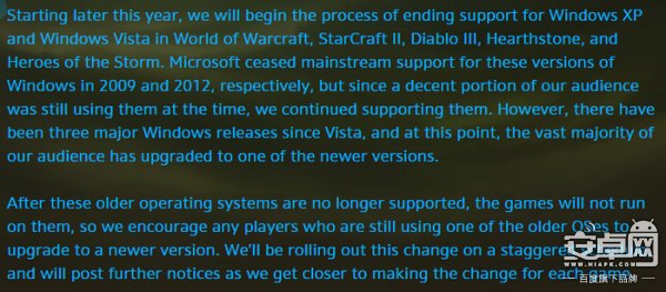 暴雪官方近日宣布,旗下多款游戲將停止對(duì)Windows XP和Vista系統(tǒng)的支持,并希望玩家盡快升級(jí)系統(tǒng),防止無法正常游戲。