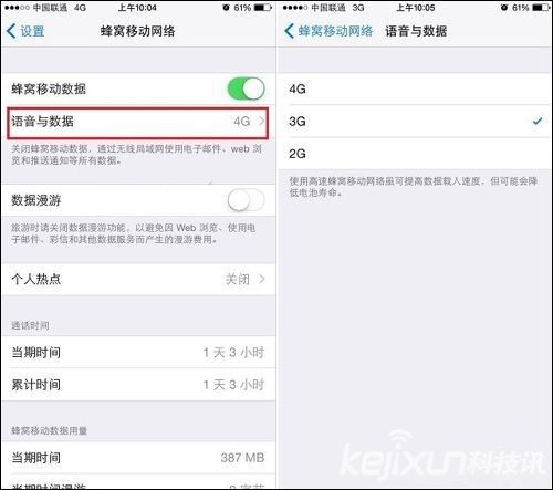 二、進入蜂窩移動網(wǎng)絡設置后,再點擊進入“語音與數(shù)據(jù)”設置,之后將默認勾選的4G網(wǎng)絡,勾選成“3G網(wǎng)絡”即可,勾選上,頂部的網(wǎng)絡標識就是3G網(wǎng)絡狀態(tài)了,如下圖所示。