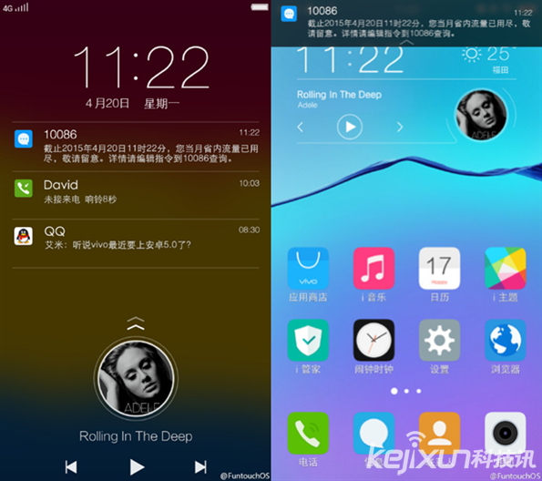 另外,最值得注意的是,基于Android 5.0深度定制的Funtouch OS 2.1系統在鎖屏界面上加入了可以顯示信息詳細內容的消息通知欄,和iOS非常類似,并且效果看起來非常唯美。