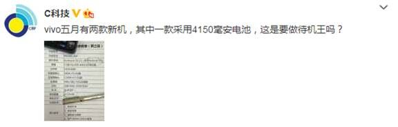 據(jù)@C科技稱:vivo五月有兩款新機(jī),其中一款采用4150毫安電池,這是要做待機(jī)王嗎?