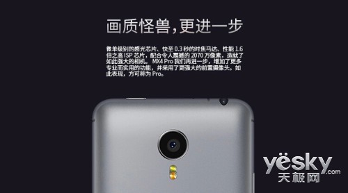 攝像頭方面,MX4 Pro并沒有進行大的升級。主像頭采用了索尼CMOS IMX220 ,有效像素為2070萬。光圈為F2.2,配備雙色閃光燈。前置攝像頭為500W 像素 ƒ/2.2 大光圈的攝像頭,搭配最新的 FotoNation 美顏算法和 Face AE 面部曝光增強。