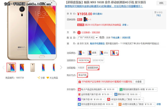 京東購買魅族MX5套餐價格是1958元,可以獲得魅族MX5 16G手機一臺,并且魅族豪華禮包里面包含有EP21耳機、皮套和貼膜,比而且這些配置也是日常使用的必要配件,所以還是比較超值。