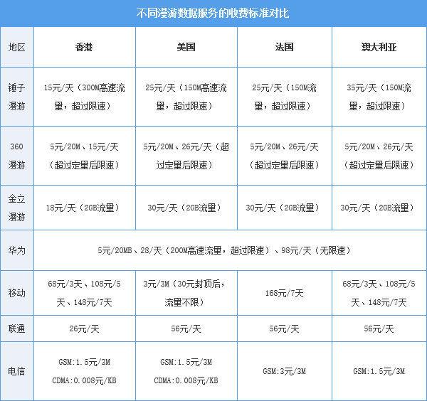 此外,金立、奇酷等廠商提供的漫游服務都和錘子漫游相似,所以在此就不再過多介紹。而華為天際通的功能則要更加豐富,除了漫游流量外,天際通還提供了100萬個海外免費熱點連接的“全球WLAN”服務。而關于資費方面,小編也簡單整理了不同漫游服務的收費標準。