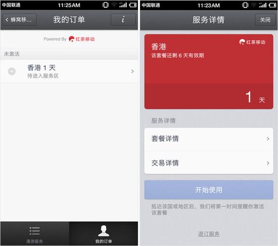 成功購買后,我們可以在漫游服務的功能菜單中找到相應的訂單。而當我們出境進入服務區后,錘子漫游服務會激活相應的套餐,而我們只需進入訂單頁面點擊 ‘開始使用’即可使用。值得一提的是,該漫游服務并不用更換SIM卡,甚至無SIM卡也可以使用,所以并不影響原來SIM卡的使用(可關閉原SIM卡的移 動流量數據,避免產生額外費用)。