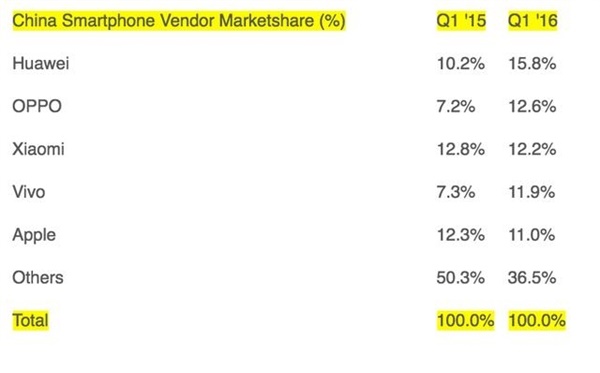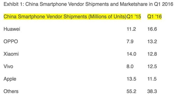 2016年Q1智能手機品牌排行:華為第一 OPPO第二