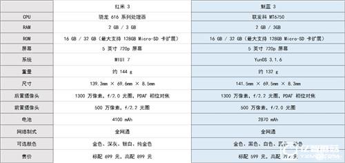 如果說外觀部分純屬于主觀意見,那到了硬件部分就直接高下立判了,紅米 3 與魅藍(lán) 3 具體參數(shù)如下:
