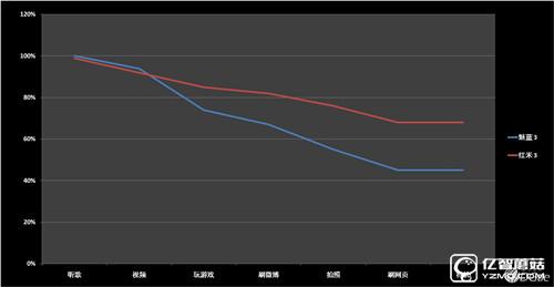 續(xù)航上其實(shí)看硬件配置也知道紅米 3 要強(qiáng)于魅藍(lán) 3,畢竟前者電池容量多了 1230 mAh,差距還是有些大的。通過 5 小時(shí)的續(xù)航測試(包括 1 小時(shí)在線視頻播放,1 小時(shí)聽音樂,1小時(shí)刷網(wǎng)頁,半小時(shí)玩游戲,半小時(shí)刷微博,半小時(shí)拍照和半小時(shí)待機(jī)),紅米 3 最終剩余 68% 電量,而魅藍(lán) 3 則剩余 45% 電量。