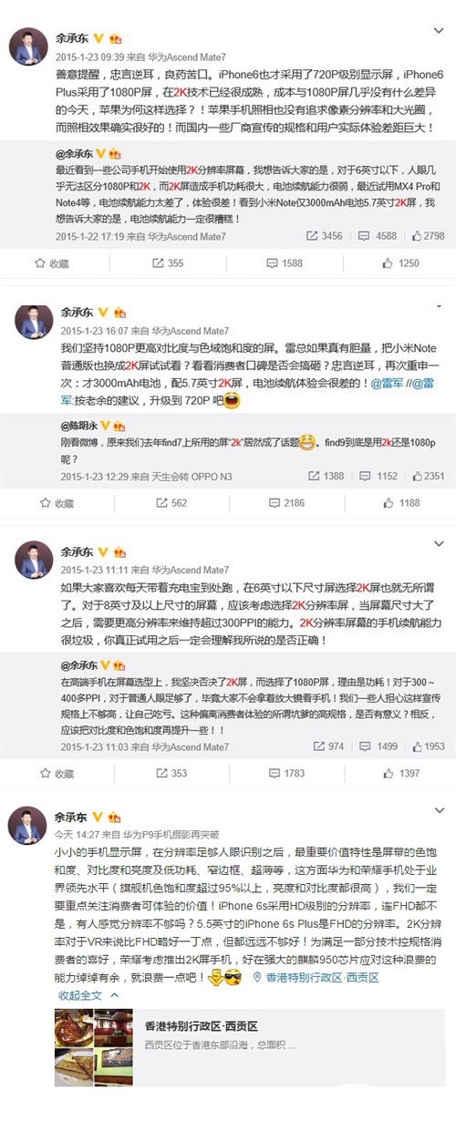 其實對比下余承東2015年和2016年關(guān)于2K屏幕的評論就能得出結(jié)論,2015年啥處理器最火?驍龍810啊!看看小米Note頂配版就知道這種搭配是多么災(zāi)難,也難怪雷布斯今年學(xué)乖了,哪怕用上改進明顯的驍龍820也只是帶1080P屏幕。另外余承東依然堅持6英寸以下屏幕1080P分辨率就足夠的言論,只不過這次被推出來的代表由iPhone 6 Plus換成了iPhone 6s Plus。