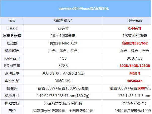 360手機(jī)N4和小米max綜合配置對(duì)比