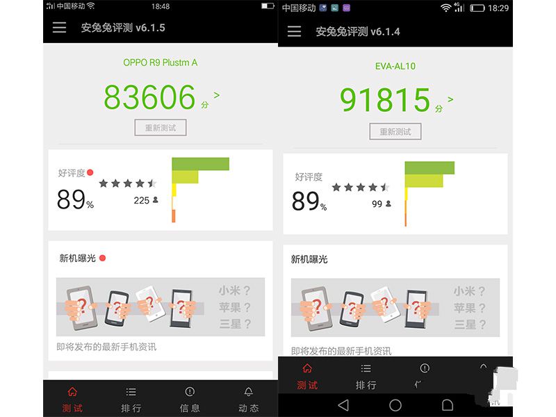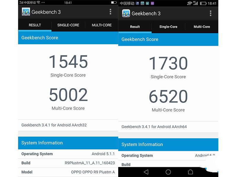 單純的跑分意義不大,但脫離了這個(gè)最簡(jiǎn)單、最直觀的量化結(jié)果,我們也很難迅速發(fā)現(xiàn)智能手機(jī)之間的性能區(qū)別。所以本文仍然將兩者跑分結(jié)果作為對(duì)比對(duì)象,為了盡量客觀,分別選取了安兔兔和Geekbench3兩款軟件進(jìn)行測(cè)試。左為OPPO,右為華為。