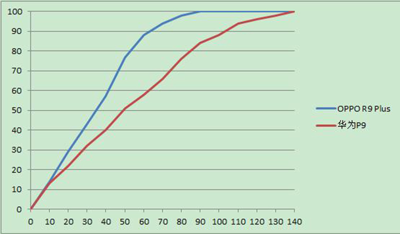 如圖表所示,在關(guān)機(jī)狀態(tài)的前10分鐘內(nèi),OPPO R9 Plus充入了14%電量,而華為P9充入了13%,實(shí)力相當(dāng)。但從第11分鐘開(kāi)啟手機(jī)以后,OPPO的VOOC閃充便發(fā)揮了超強(qiáng)功力,在第88分鐘即已充滿,而華為P9則開(kāi)始“降速”,一直到2小時(shí)20分鐘以后才宣告滿電。