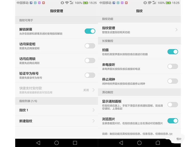 如圖所示,上圖的OPPO R9 Plus指紋管理非常簡(jiǎn)單,除了解鎖還有應(yīng)用加密和文件保險(xiǎn)箱;而華為P9的指紋應(yīng)用場(chǎng)景則非常豐富,包括了訪問(wèn)保密柜、應(yīng)用鎖、驗(yàn)證華為賬號(hào)、支付寶(未開(kāi)通)、拍照、來(lái)電接聽(tīng)、停止鬧鐘以及部分滑動(dòng)觸控功能,展示了EMUI強(qiáng)大的優(yōu)化能力。我們要說(shuō)明的是——雖然OPPO R9 Plus的指紋應(yīng)用比較簡(jiǎn)單,但在日常生活中已經(jīng)足夠滿足需求,而華為P9指紋設(shè)計(jì)未免花哨,以指紋停止鬧鐘為例——當(dāng)你想關(guān)閉鬧鐘的時(shí)候是選擇觸碰屏幕還是先想一下用哪個(gè)手指去觸碰指紋呢?