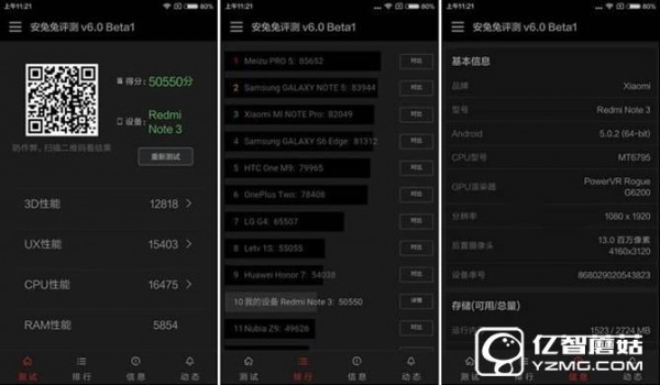 通過最新版安兔兔V6.0跑分軟件測試后,我們不難看到紅米Note3安兔兔跑分成績為49999分,算是達到了5萬分,處于搭載helio X10處理器手機跑分的較為領先的水平,能夠滿足日常的基本應用以及流暢的應付一些較大型的大型游戲。