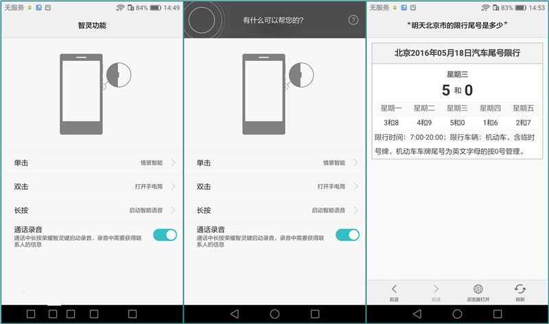 不過智靈鍵本身激活的語音助手,起碼在限行尾號這一查詢中壓勝iPhone6s Plus,但是在實際使用過程中,給我帶來的最大不便就是其語音識別的準確度相較于iPhone來說有些低,希望榮耀在后續能夠加強這一塊。
