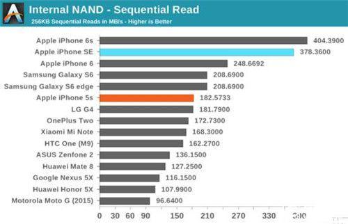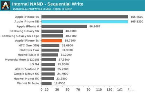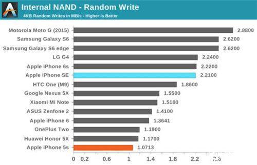 在這個測試中iPhone SE的表現也很不錯,奇怪的是iPhone 6s的分數低于iPhone SE,AnandTech無法確定這是因為驅動器不同導致的還是因為其他的什么原因。不過iPhone SE和 iPhone 6s的分數在測試中是最高的,是iPhone 5s的三倍。