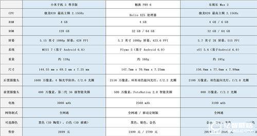 自從驍龍810坑了不少隊友的時候,我們都在期待著高通下一代旗艦處理器的登場。今年的小米手機5尊享版和樂Max2也都不出意外的用上了新的旗艦處理器—驍龍820,其中的小米手機5只有尊享版和高配版用上了標(biāo)準(zhǔn)主頻的驍龍820處理器,標(biāo)準(zhǔn)版本或許是考慮成本問題而選擇了降頻版本的820,這點有些讓人可惜。至于魅族這次并沒有采用三星的旗艦處理器,而是選擇了聯(lián)發(fā)科的旗艦處理器HelioX25,由于聯(lián)發(fā)科的處理器被大量運用在中低端機型上,所以使得多數(shù)用戶對于魅族PRO6的性能產(chǎn)生了置疑。下面先來看一下三臺旗艦機型的參數(shù)配置表: