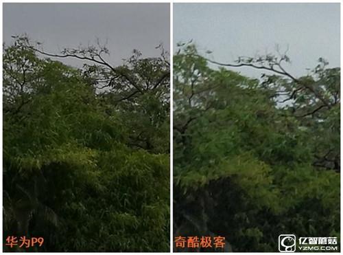 放大至100%之后,兩者之間的差距就出來了,華為P9的亮度雖然不濟(jì),但細(xì)節(jié)保留更多,基本能看清楚樹葉的輪廓,而奇酷極客的涂抹感就非常強(qiáng),在樹葉的部分已經(jīng)糊成一片,最上面的樹枝的輪廓也不清晰。