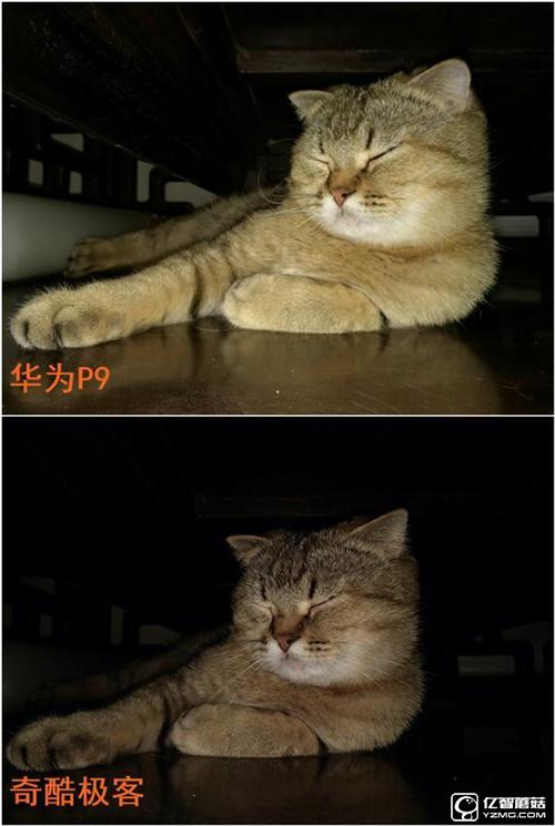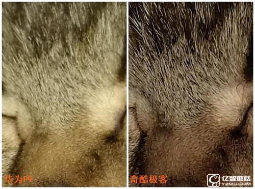 放大至100%之后,和之前的表現(xiàn)不同,華為P9在貓毛上的細(xì)節(jié)不及奇酷極客,后者的細(xì)節(jié)更加豐富,但暗部有明顯的涂抹痕跡。