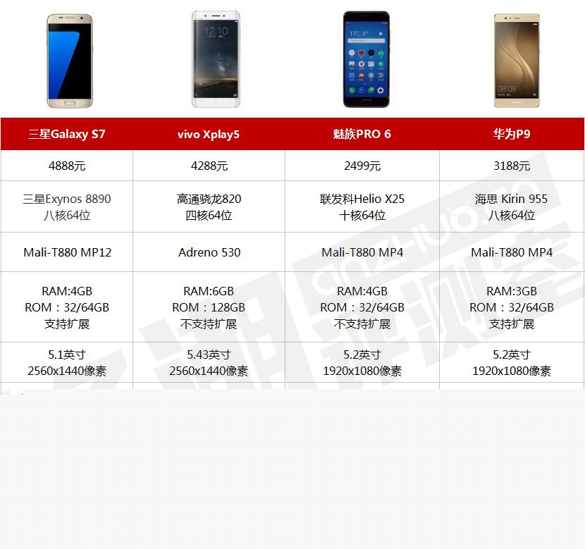 我們選擇了4款旗艦機型作為評測對象,它們都是2016年自家品牌的旗艦手機。分別有:三星Galaxy S7(港版)、vivo Xplay5(旗艦版/全網通)、魅族PRO 6(全網通)、華為P9(標準/全網通版),(排名按照發布會順序排列)。下面看一下它們的詳細配置。