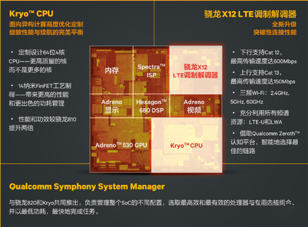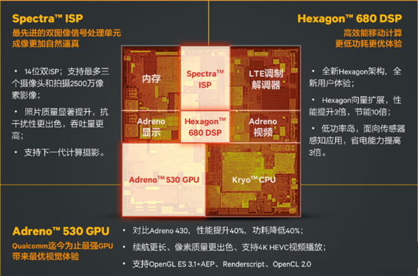 驍龍820主要由Kryo CPU、Adreno 530 GPU、Spectra ISP、Hexagon 680 DSP和驍龍X12 LTE調制解調器組成。SoC內部通過Qualcomm Symphony System Manager進行統籌,合理調度各個模塊進行運算并獲得最高能效比。驍龍820給我們最大的印象就是充分體現了分工合作的異構計算思想,CPU負責通用計算部分,GPU專注圖形處理過程,ISP鉆研拍照時候各種算法,DSP統籌各種內部傳感器,驍龍X12 LTE調制解調器讓網絡傳輸速度更快,兼備VoLTE、4G+和全網通等特性。