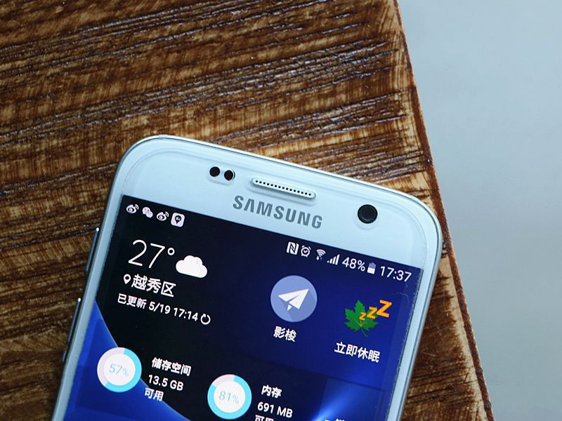 除此之外三星Galaxy S7的外觀變動不大,尺寸上固定在5.1英寸,配備Super AMOLED的2K屏幕,并沒有試探著與Note系列爭奪地盤。正面的2.5D曲面,Galaxy S7要比S6收起的弧度更明顯,這在光線下可以很清楚的看到。