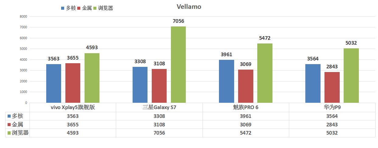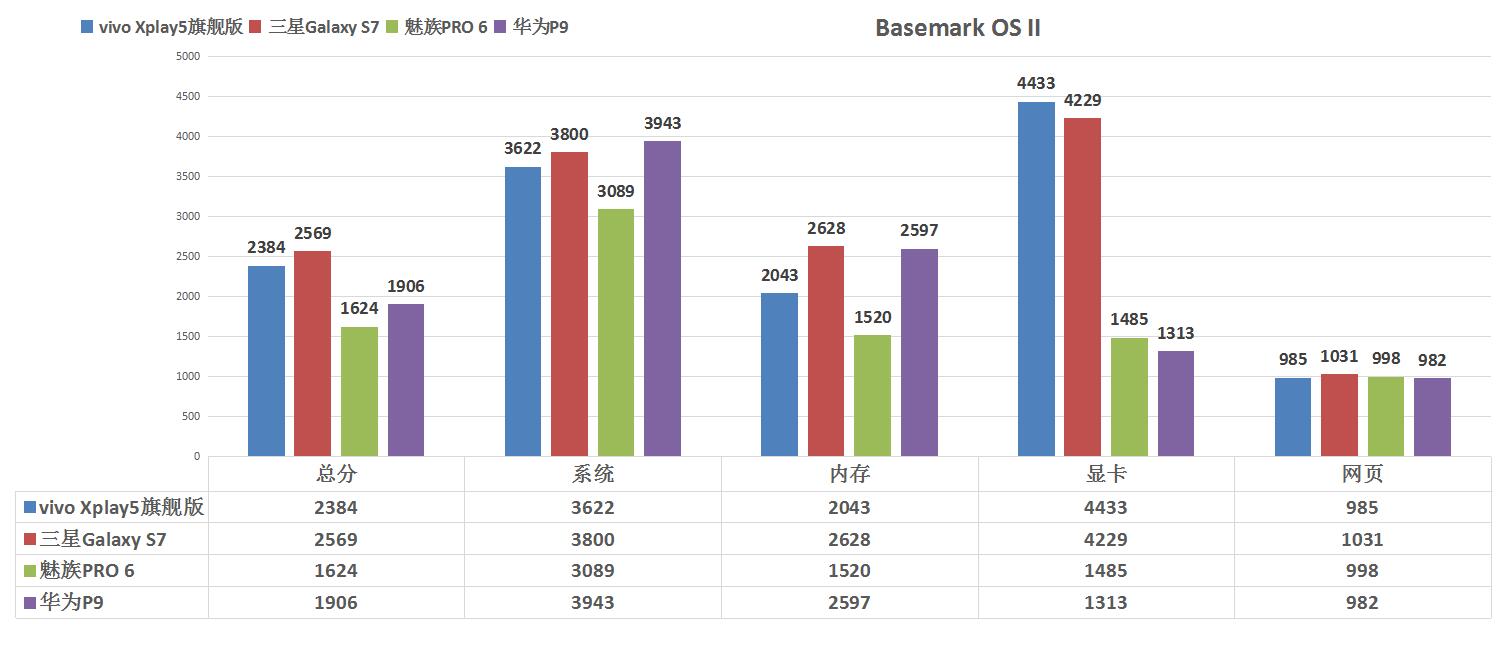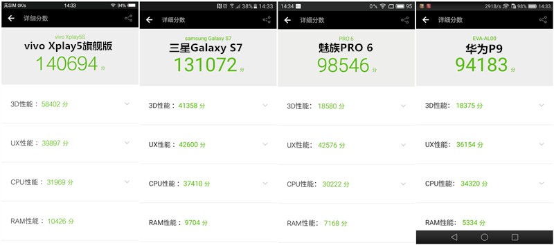 性能測試結果:vivo Xplay5旗艦版>三星Galaxy S7>魅族PRO 6> 華為P9