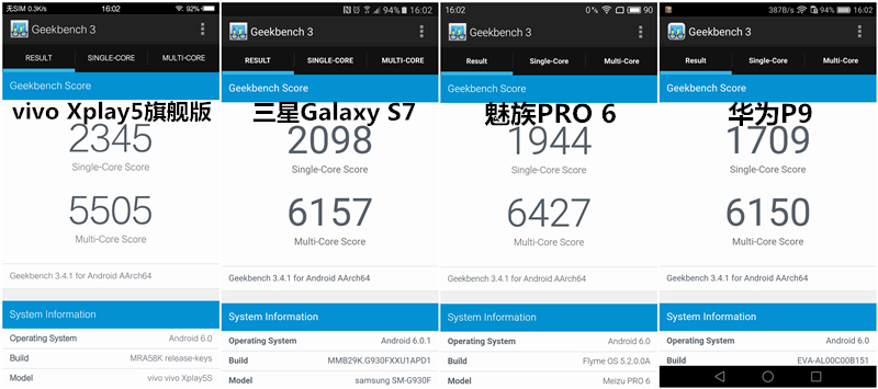 (多核)魅族PRO 6>三星Galaxy S7>華為P9>vivo Xplay5旗艦版